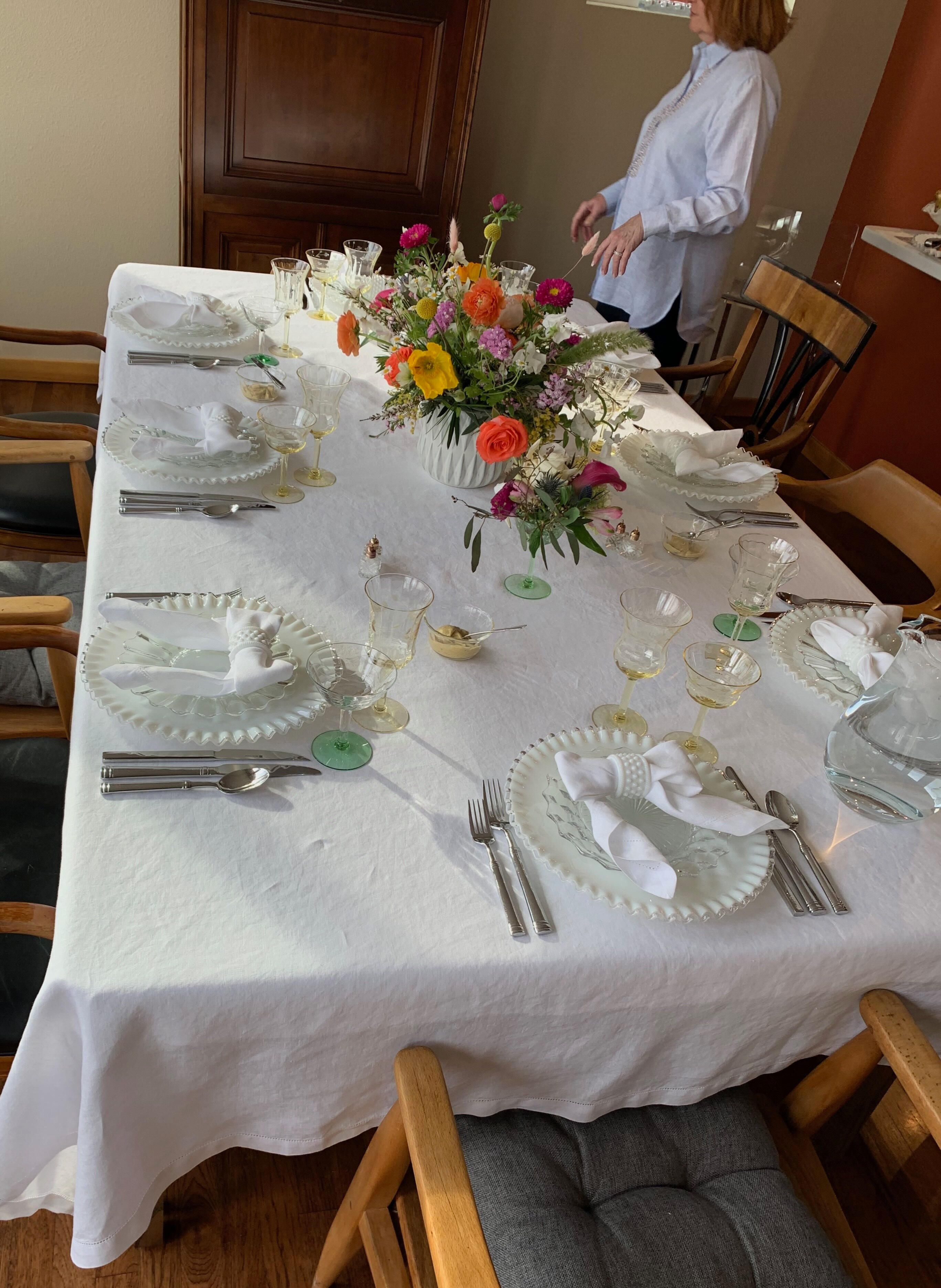 Fenton Silvercrest milk glass paired with cut glass and yellow and green Depression glass creates a light-filled table designed for gathering.