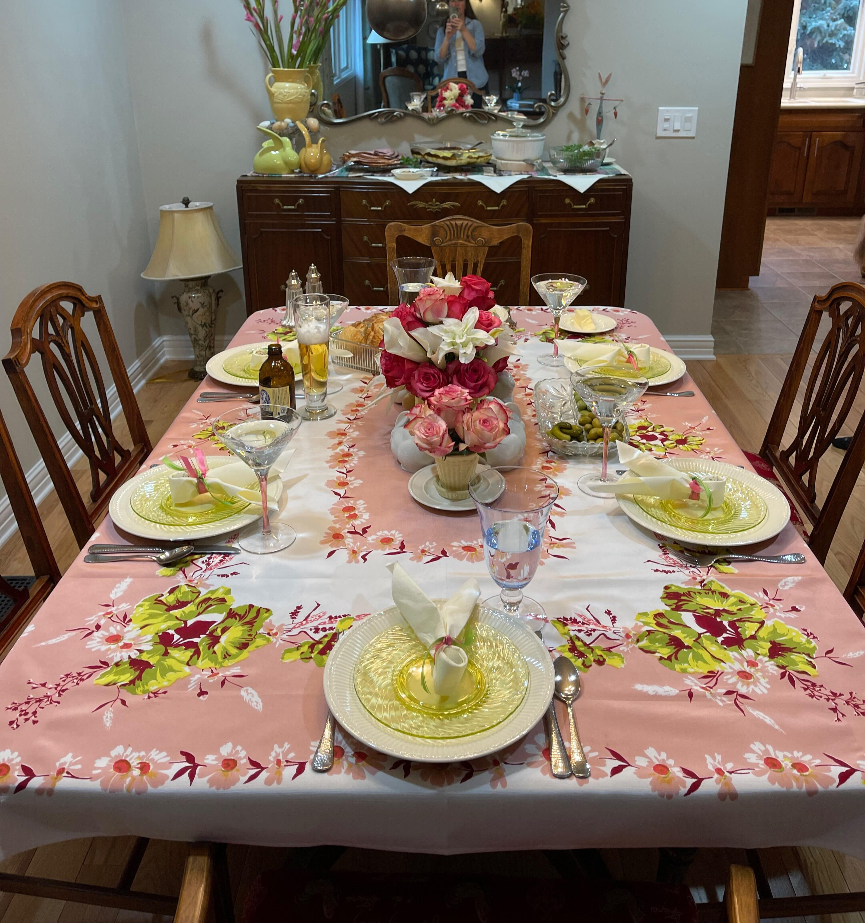 Wedgwood Edme china paired with uranium glass plates, English chintz, and McCoy pottery creates a bright spring table.