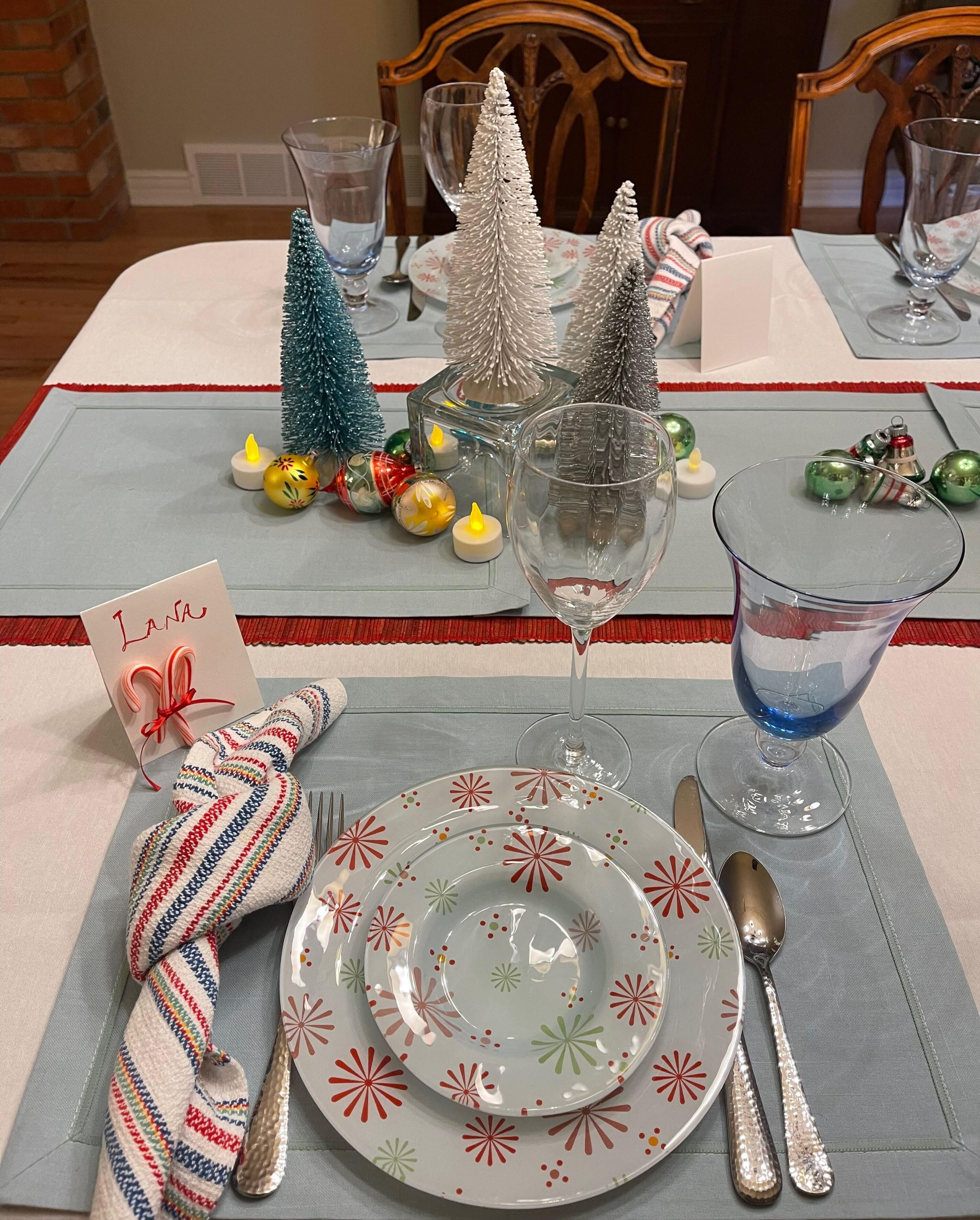 Snowflake glass plates, vintage ornaments, and brushed bottle-brush trees create a winter table layered in blue glass and candlelight.