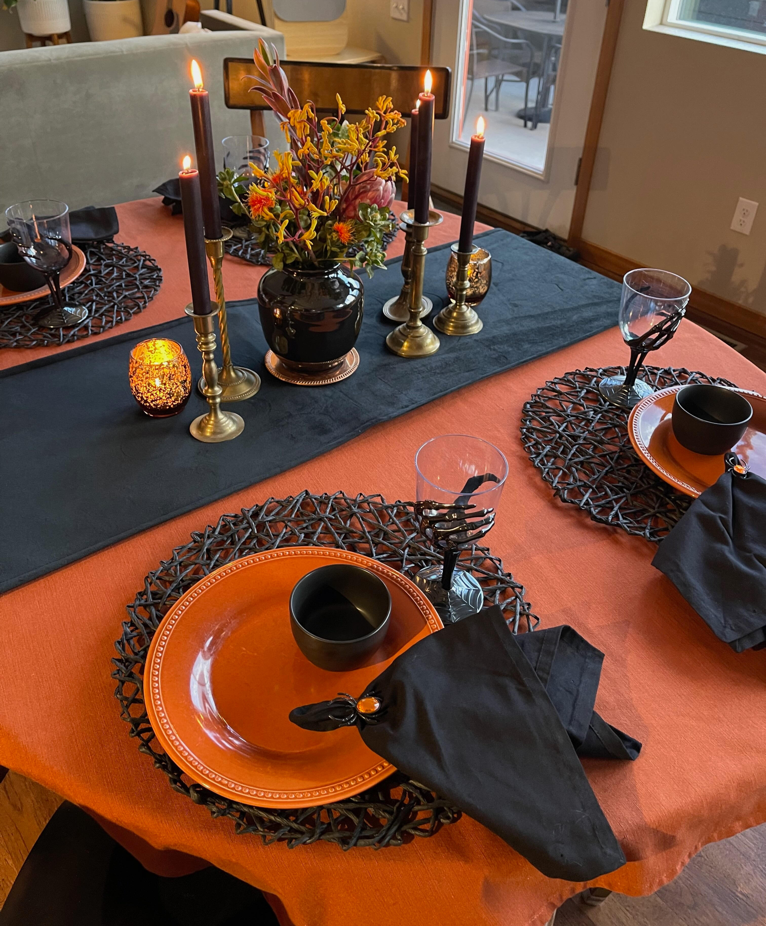 Copper tones, spider-web placemats, and playful skeleton goblets create a Halloween table that is just a little delightfully spooky.