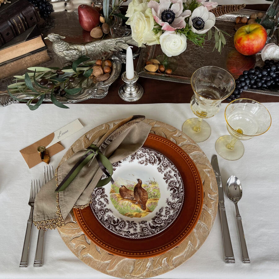 Spode Woodland paired with warm earthenware and layered vintage silver creates a harvest table rich in texture and detail. Trays, candlesticks, and gathered objects bring a sense of abundance while keeping the setting grounded and inviting.